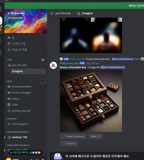Discard채팅방으로 접속 하여서 midjournet bot 에게 명령어를 내리면 그림이 그려집니다.