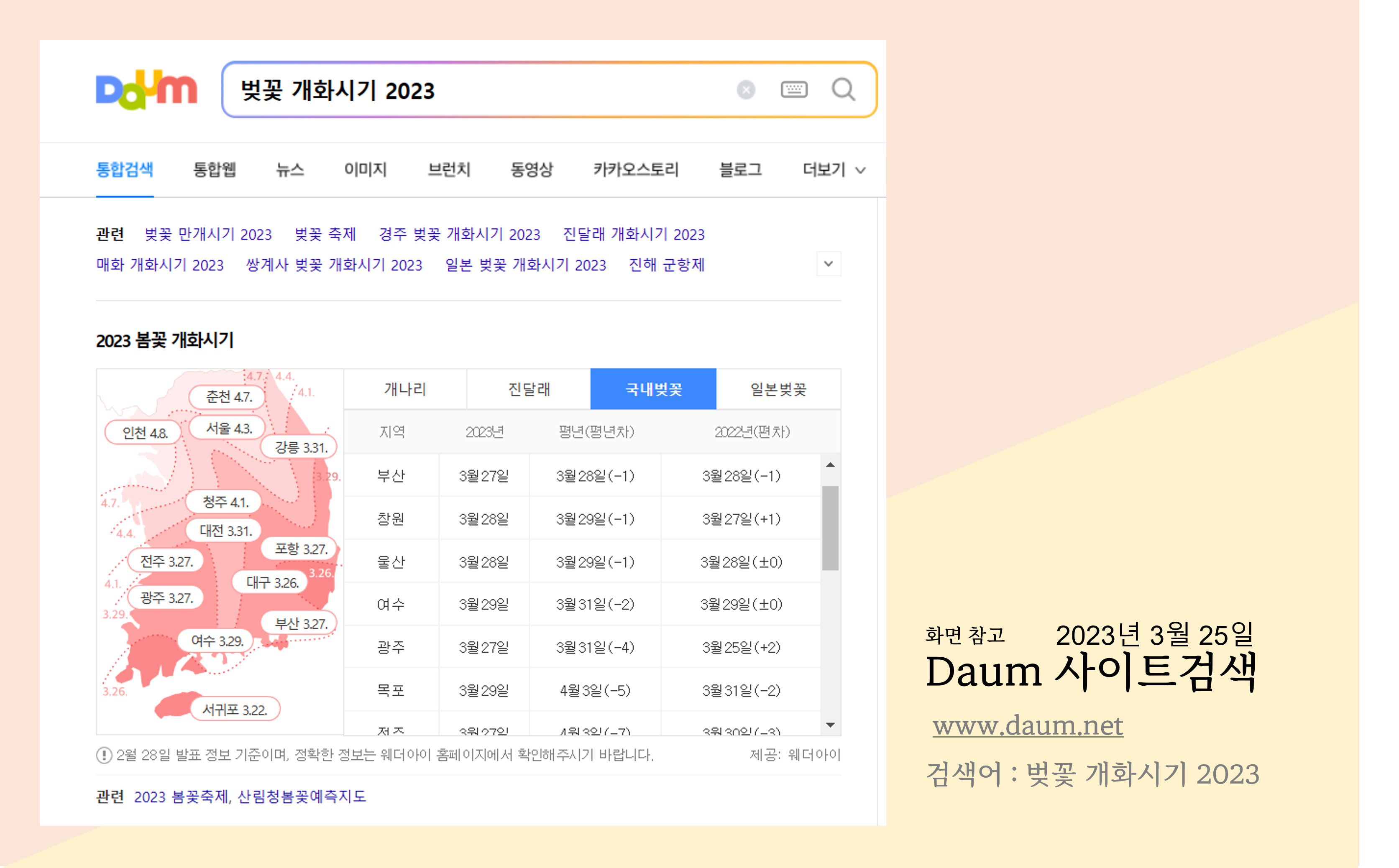 다음은 개나리 , 진달래, 그리고 일본 벚꽃까지 정보를 제공하고 있습니다.