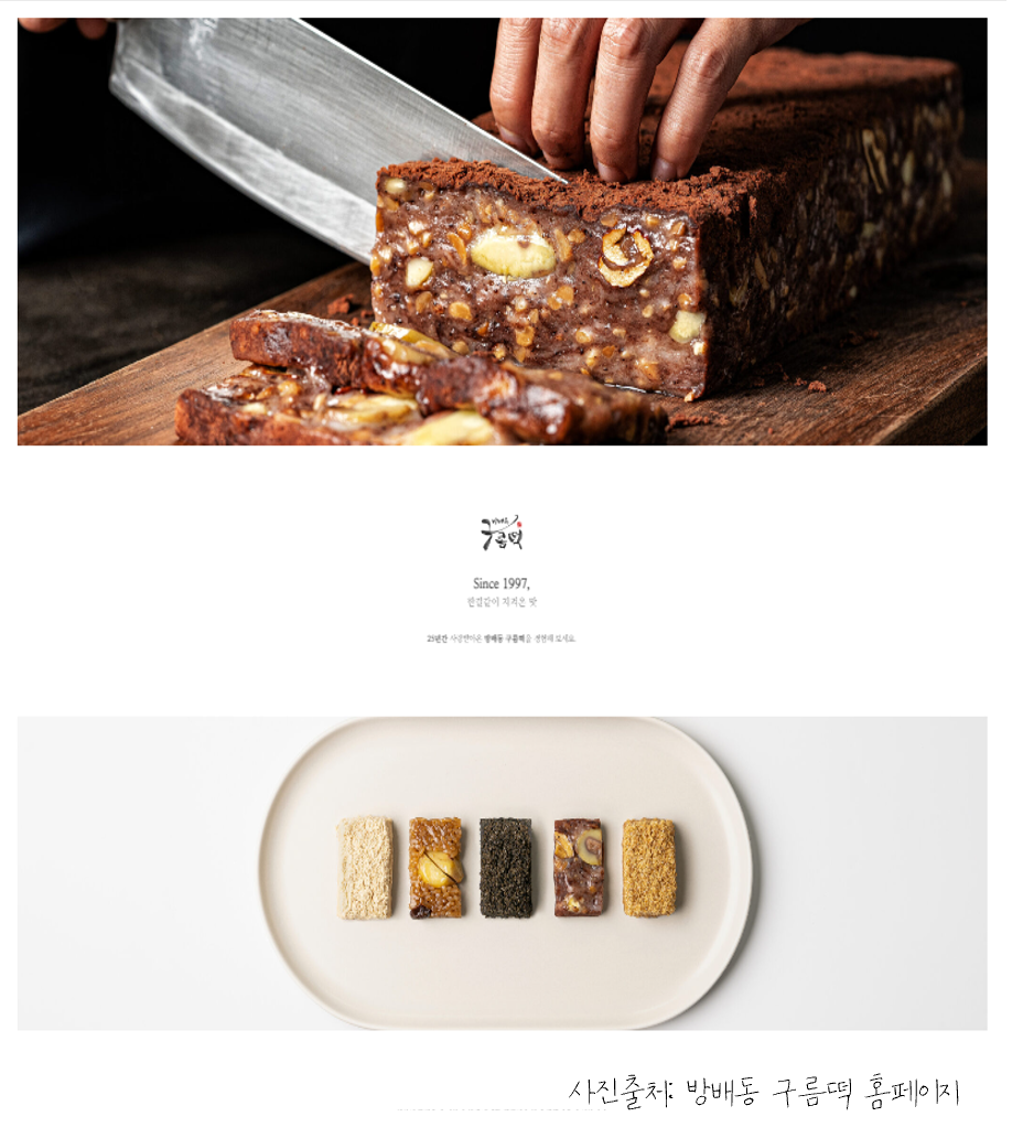 방배동 구름떡은 5년 전쯤 아는 지인집에서 처음 접했습니다. 부부 모임으로 여러 명이서 같이 식사를 하고 후식으로 구름떡과 흑임자인절미를 내주었습니다.. 이미 식사를 거하게 한지라 내심 후식으로 먹을 수 있을까 생각했으나 생각과는 달리 이미 두 가지 떡을 목구멍에서 삼킨 저의 모습을 발견하였습니다. 그리곤 자리에 모인 여자들은 이미 떡을 어디서 샀는지 한참을 떡집 얘기를 했고, 저는 바로 다음 날 박스채로 주문을 했습니다. 당시 서울에 살아 떡집에서 직배송을 받아 볼 수 있어 매장에 가지 않고 전화주문으로 했던 기억이 있습니다. 또 그때는 2인 가족이라 양이 많아 냉동고에 쟁여 두고 아침대용으로 하나씩 꺼내 먹었습니다. 최근에는 경기지역으로 이사를 와 주문을 할 생각을 안 하고 있었는데 글을 작성하니 구름떡의 맛과 식감이 자꾸 생각 납니다.