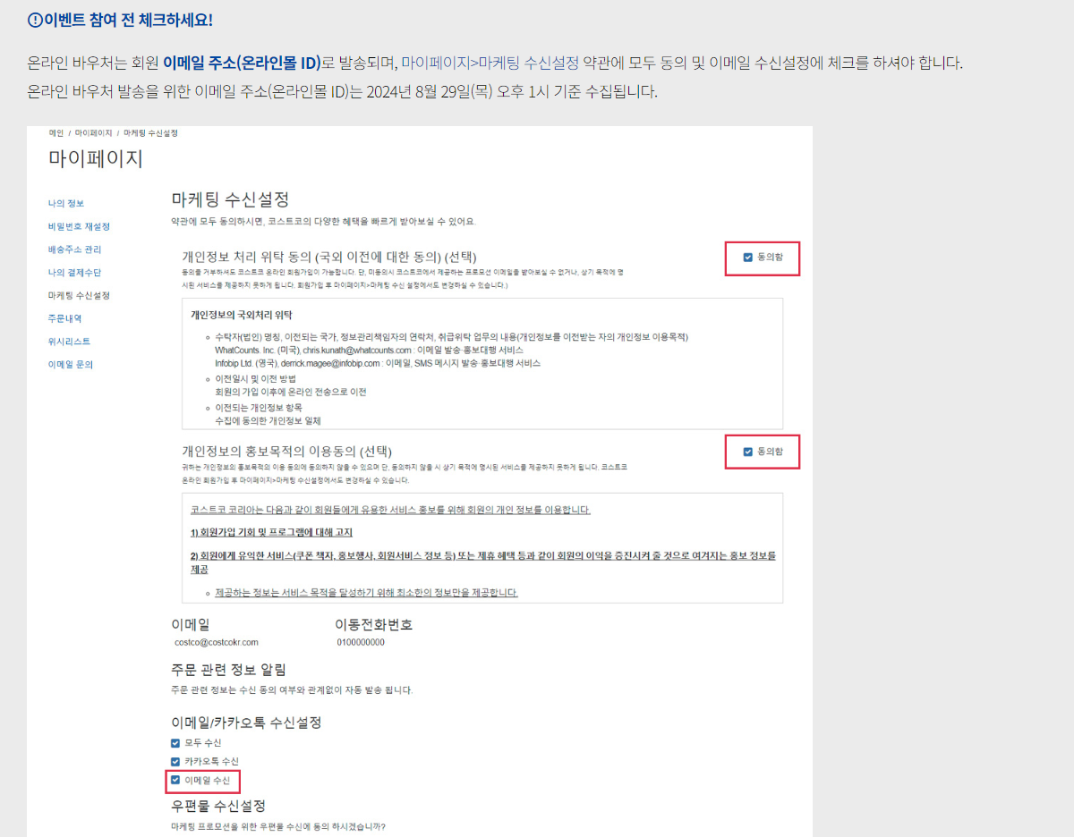 코스트코 온라인몰에서 마케팅 이메일 수신 동의 체크하고