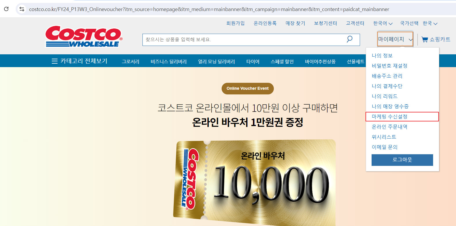 ① 코스트코 사이트 로그 > 마이페이지 > 마케팅 수신설정 접속