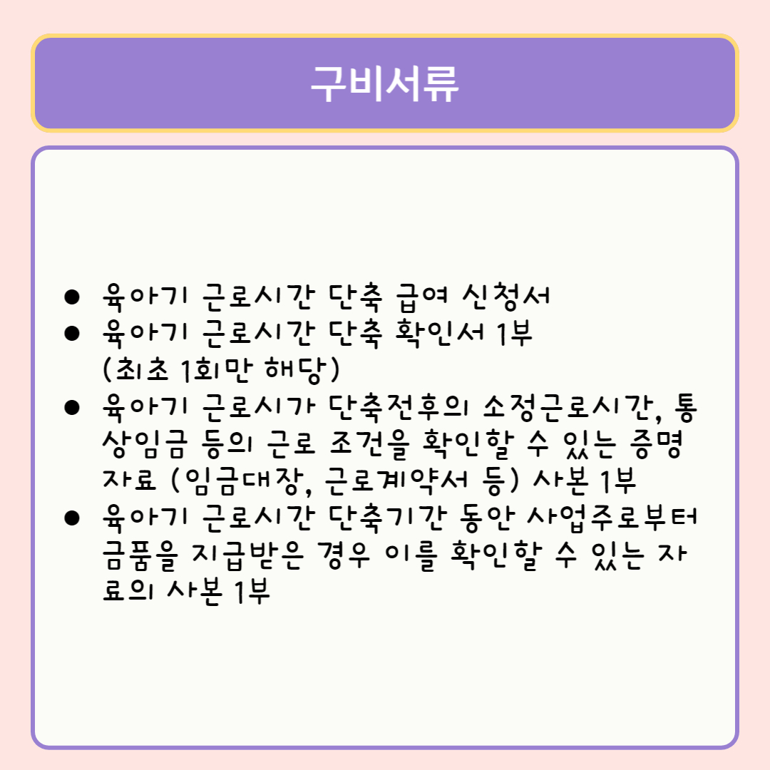 구비서류 육아기 근로시간 단축 급여 신청서 육아기 근로시간 단축 확인서 1부(최초 1회만 해당) 육아기 근로시가 단축전후의 소정근로시간, 통상임금 등의 근로 조건을 확인할 수 있는 증명자