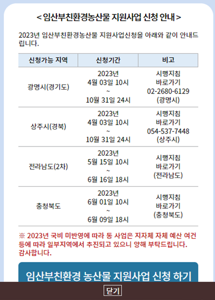 2023년도 5월 중순 현 기준, 경기도 광명시, 경북 상주시, 전라남도, 충청북도가 신청을 받고 있고, 나머지 지역은 마감된 상태 입니다. 기존에는 선착순으로 하였으나, 현 기준으로는 추첨제로 진행하고 있어 해당 지역으로 등록되어 있다면 신청 가능합니다.