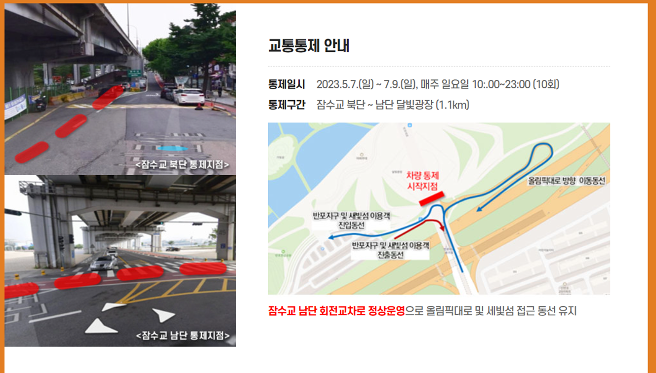 - 운영내용 : 2023 서울거리공연단이 잠수교에서 보이는 버스킹 공연으로 다양한 장르와 공연으로 구성되어 시민에게 수준높은 문화공연을 선보일 예정