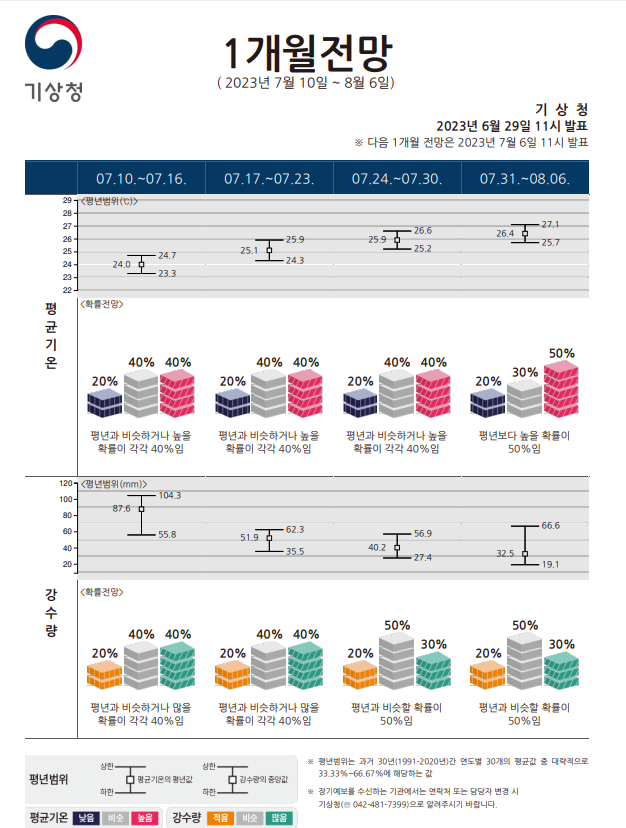 1개월 전망 보고서의 내용 구성과 7월 기온과 강수량 전망을 알아보겠습니다.