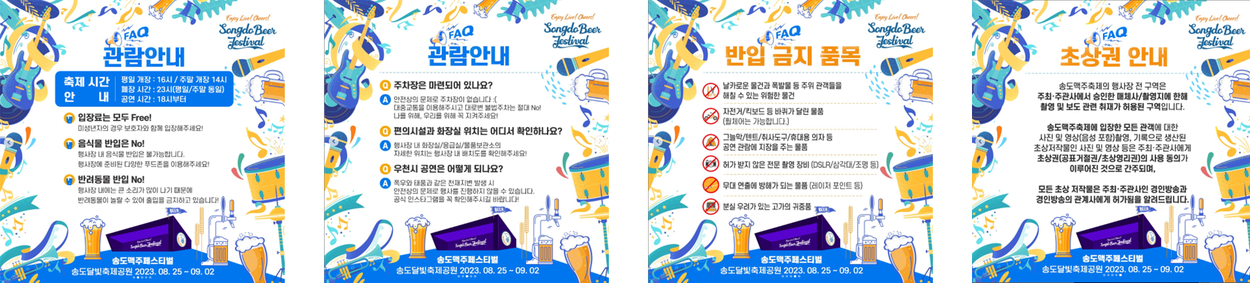 • 우천시 공연 : 천재지변으로 인해 행사 운영이 불가피한 경우,송도맥주축제 홈페이지와 SNS 공식 페이지를 통해 안내