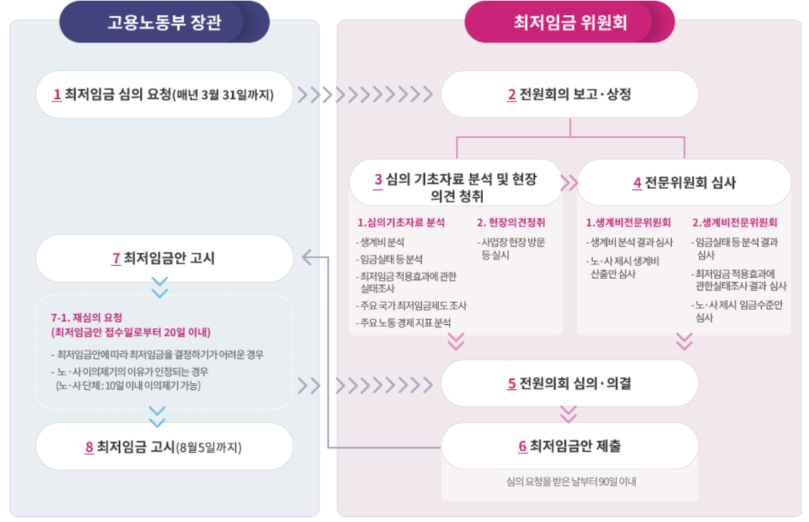 심의 과정: 고용노동부 장관 심의 요청 > 전원 회의 보고 상정 > 심의 기초자료 분석 및 현장 의견 청취 > 전문 위원회 심사 > 전원 의회 심의, 의결 > 최저임금안 제출