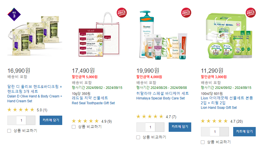 핸드크림 및 워시 용품과 간단한 식용품 및 위주의 실속있는 선물세트가 많음